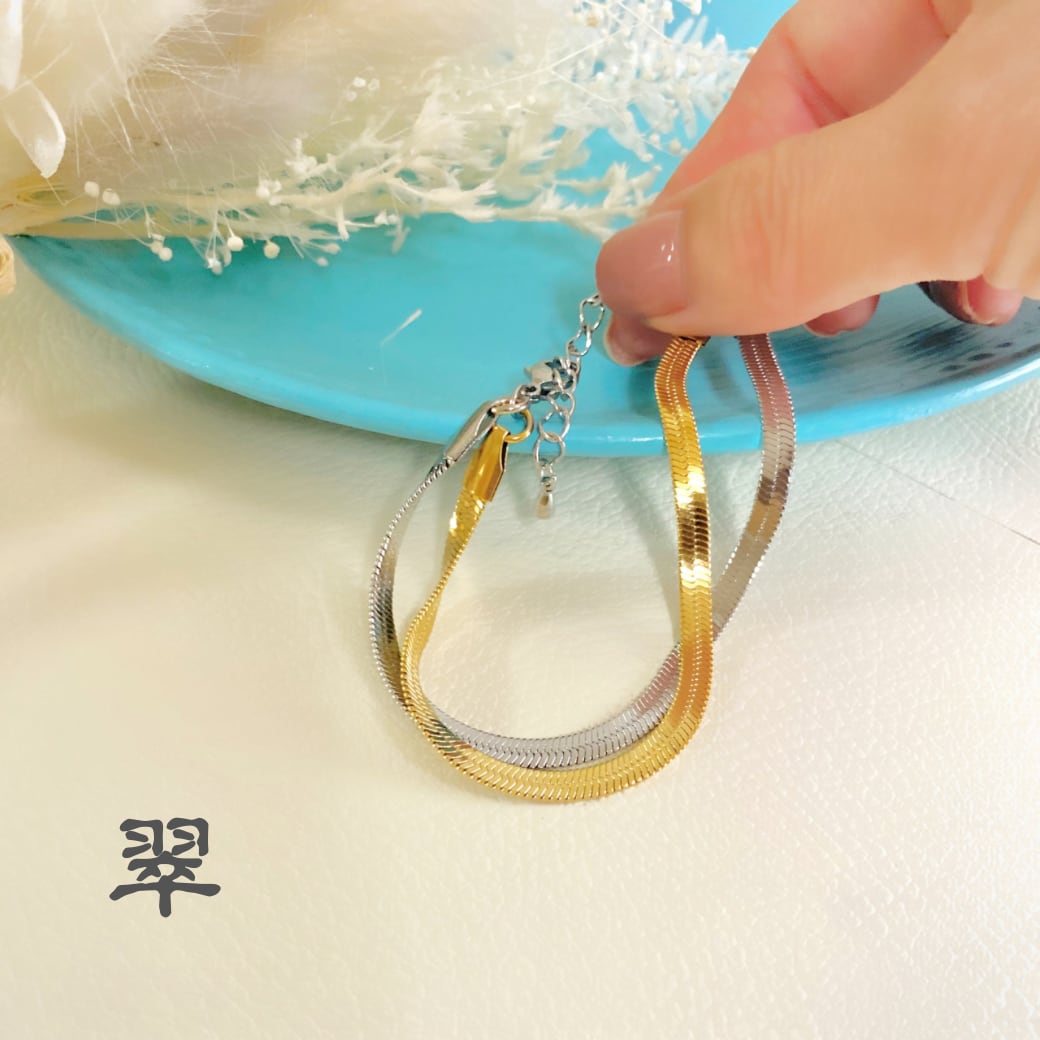 スネークチェーンをゴールドとシルバーの両方を繋げたブレスレットです。