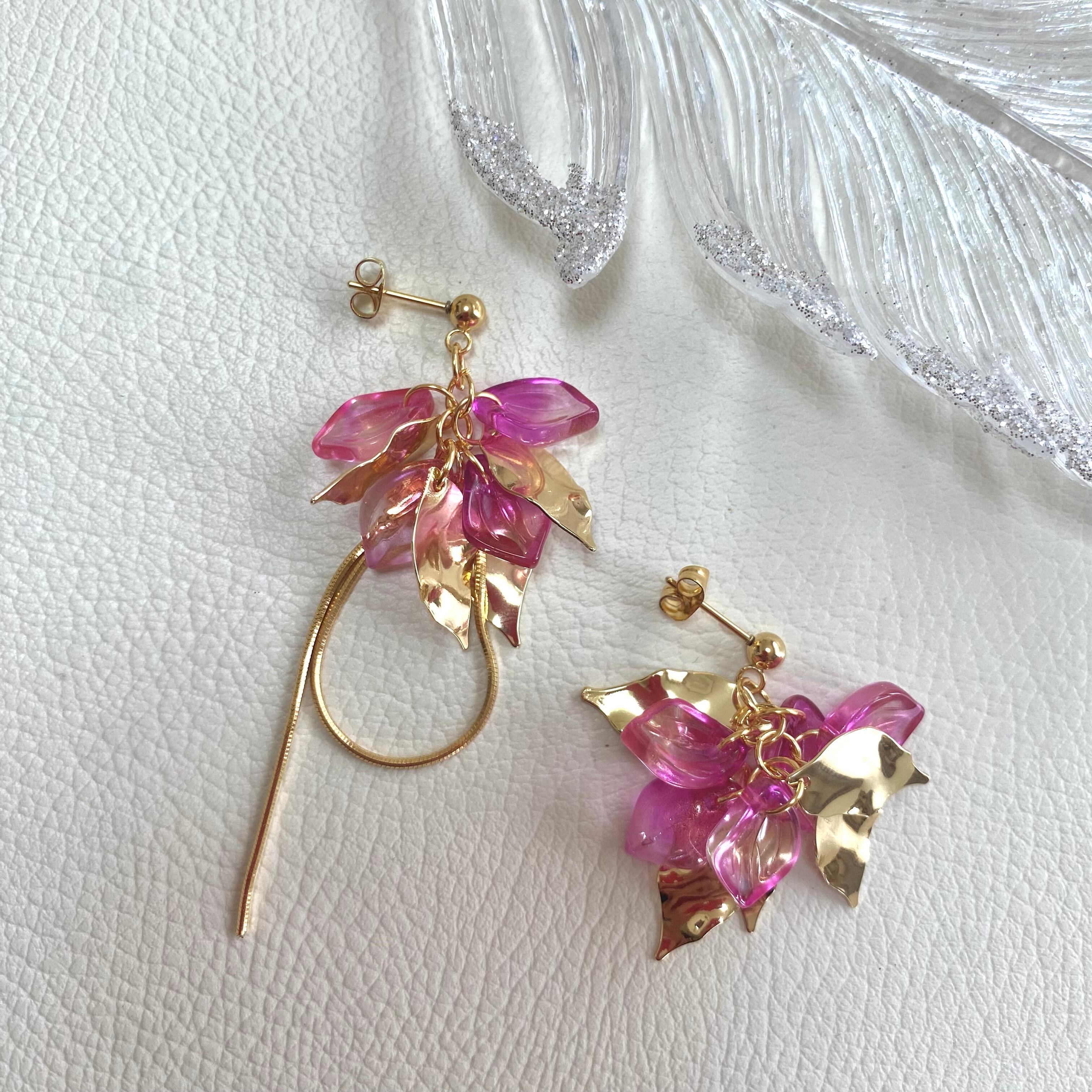 メタル系の葉っぱと花びらのようなカラーパーツを組み合わせて作っています。アシンメトリーに着用頂けてコーディネートのアクセントに!