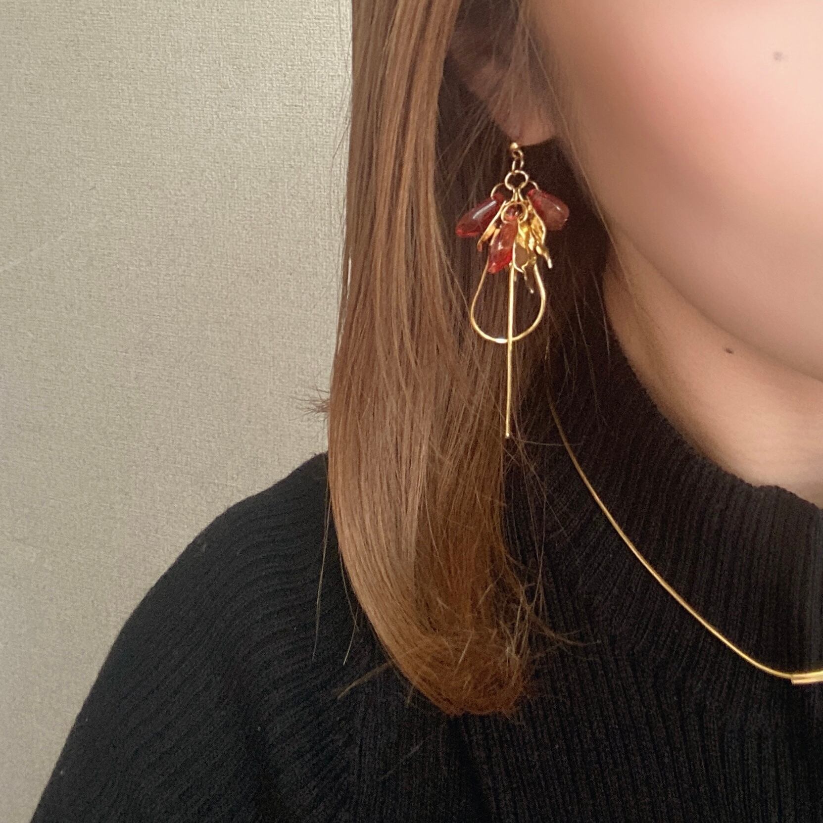 メタル系の葉っぱと花びらのようなカラーパーツを組み合わせて作っています。アシンメトリーに着用頂けてコーディネートのアクセントに!