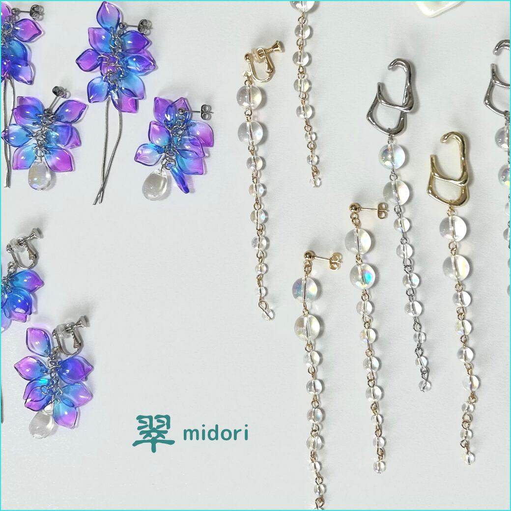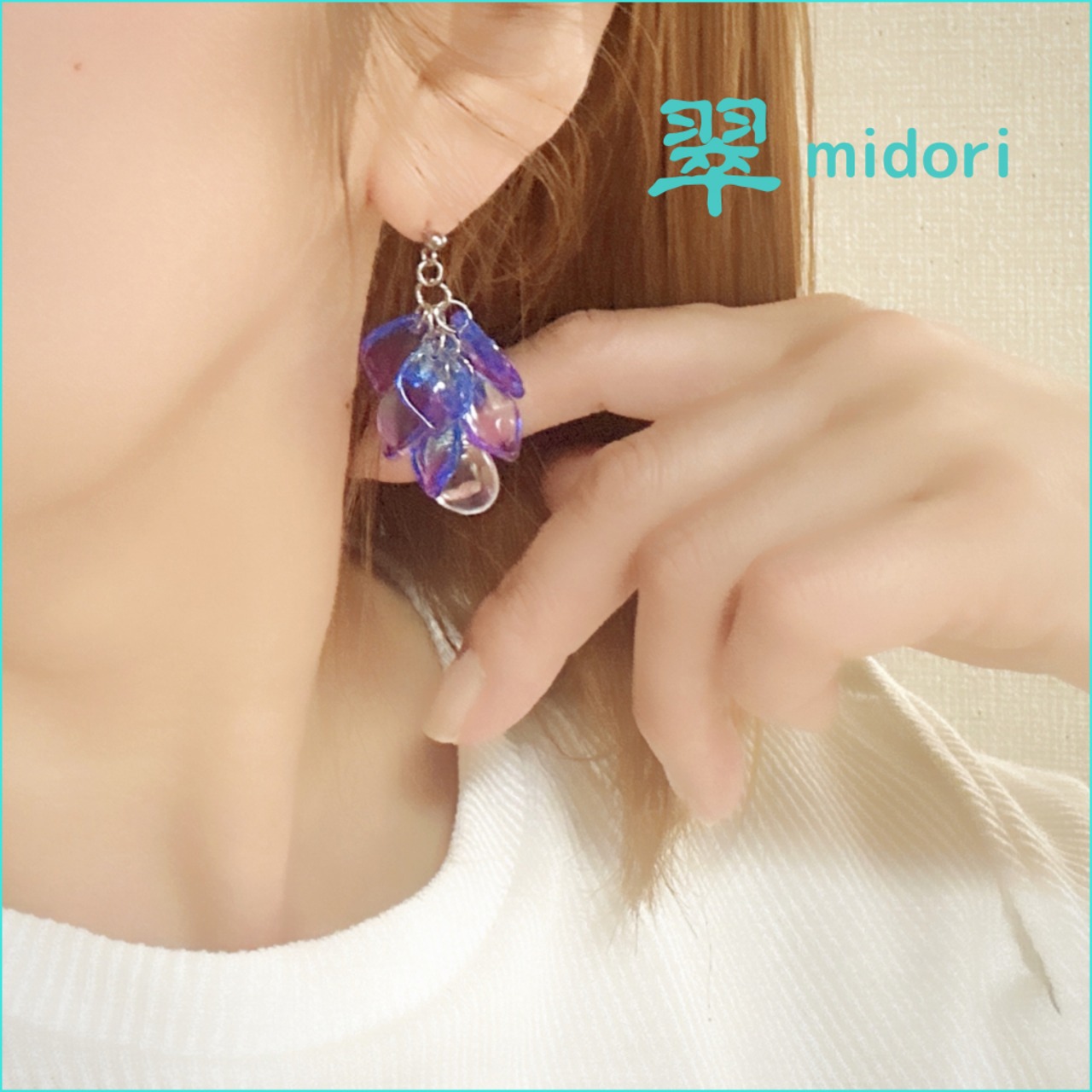 花びらのようなカラーガラスパーツを組み合わせて作っています。アシンメトリーに着用頂けてコーディネートのアクセントに!